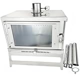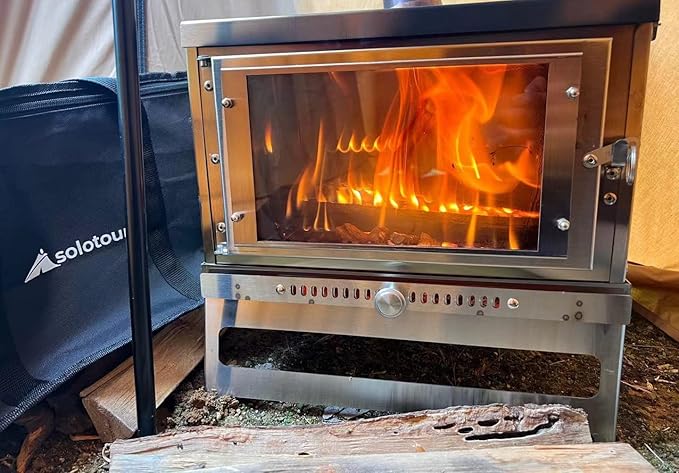 大型ガラス窓で炎が見え、大小のゴトクで同時調理が可能です。脚を広げるだけの簡単組立、煙突高さや脚の高さ調整機能、収納バッグ付きでコスパ良好。網や扉など調理向けの装備が豊富。
